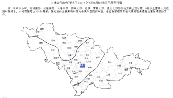 吉林省气象台7月8日13时45分发布强对流天气蓝色预警:预计未来24小时,白城南部、松原南部、长春东部、四平大部、辽源、吉林大部、通化北部部分地方将出现冰雹、8级以上雷暴大风或短时强降水,小时雨强可达30-50毫米;强对流的主要影响时段为今天午后到前半夜,省应急管理厅和省气象局联合提醒注意做好预防工作。