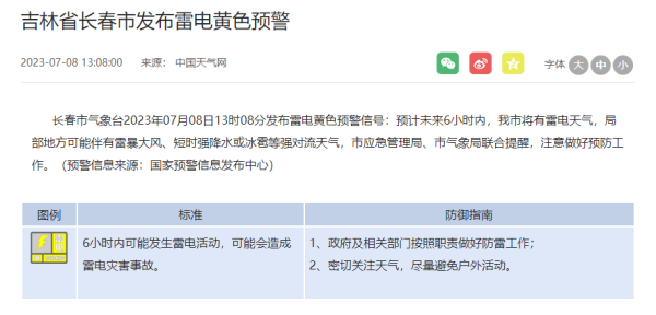 长春市气象台2023年7月8日13时08分发布雷电黄色预警信号:预计未来6小时内,长春市将有雷电天气,局部地方可能伴有雷暴大风、短时强降水或冰雹等强对流天气,市应急管理局、市气象局联合提醒,注意做好预防工作。