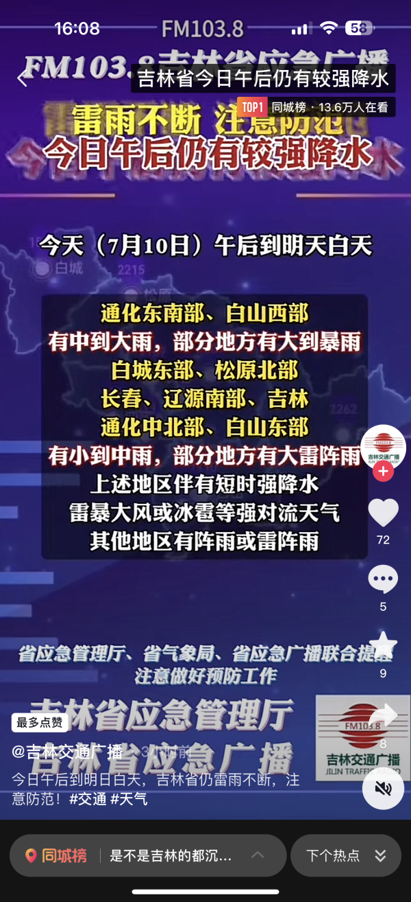 而此时此刻,吉林省午后的较强降水也登上了同城榜的“热搜”。