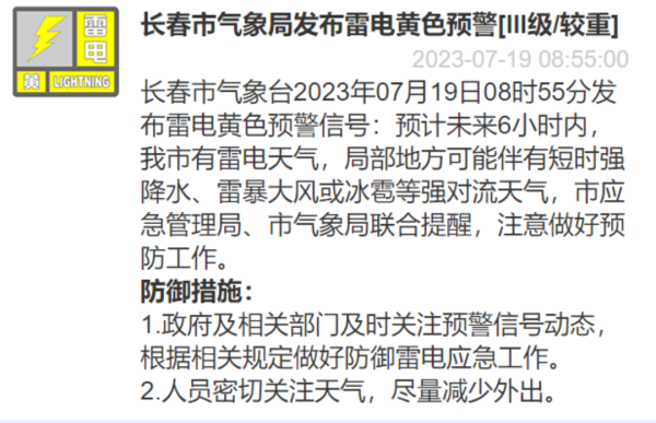 “雷电黄色预警”内容十分明晰:预计未来6小时内,长春市有雷电天气,局部地方可能伴有短时强降水、雷暴大风或冰雹等强对流天气。