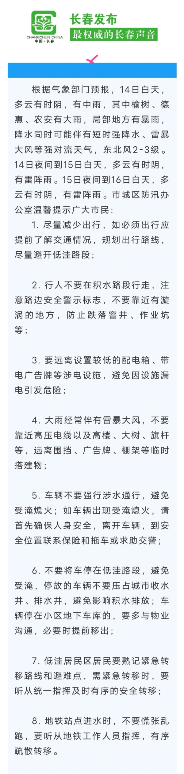 应对这样的大雨天气,我们应该注意哪些?来看看此前长春发布《长春市城区防汛安全提示》,或许对您能有所帮助。