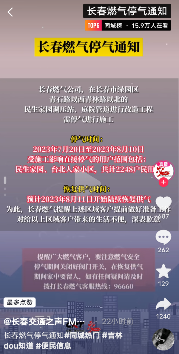 长春燃气股份有限公司发布公告,在长春市绿园区青石路以西青林路以北的民生家园调压站、庭院管道进行改造工程,需停气进行施工,停气时间为2023年7月20日至2023年8月10日,受施工影响直接停气的用户范围包括:民生家园、台北人家小区,共计2248户民用户。