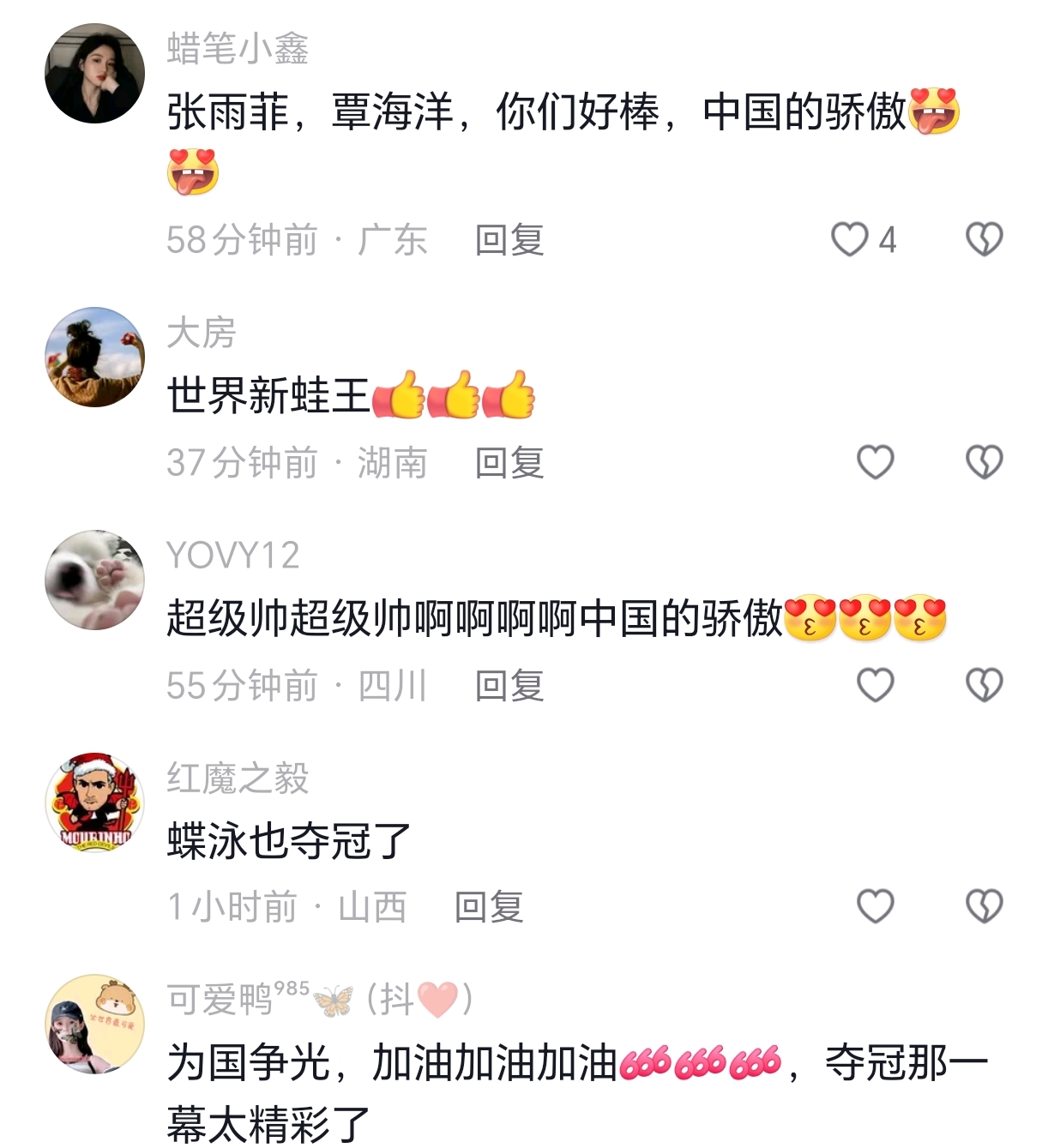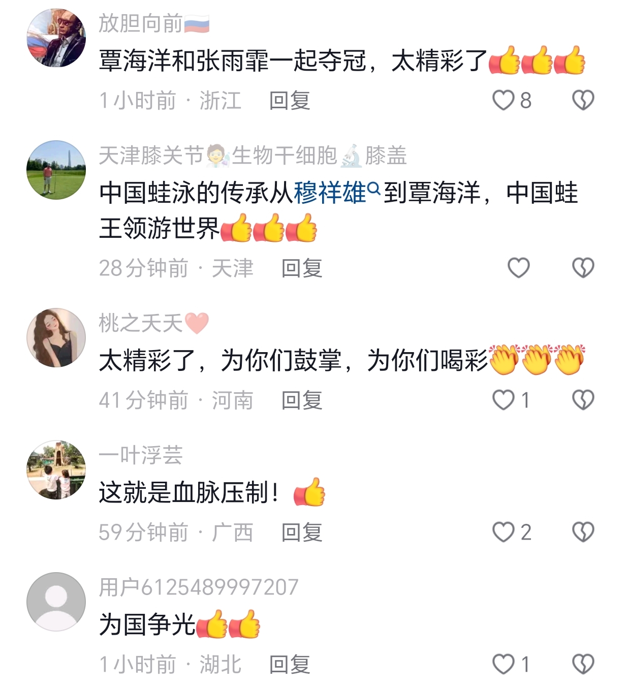 北京时间7月24日,在福冈游泳世锦赛男子100米蛙泳决赛中,中国选手覃海洋以57秒69拿下金牌,这也是中国男子蛙泳历史上的首枚世锦赛金牌。