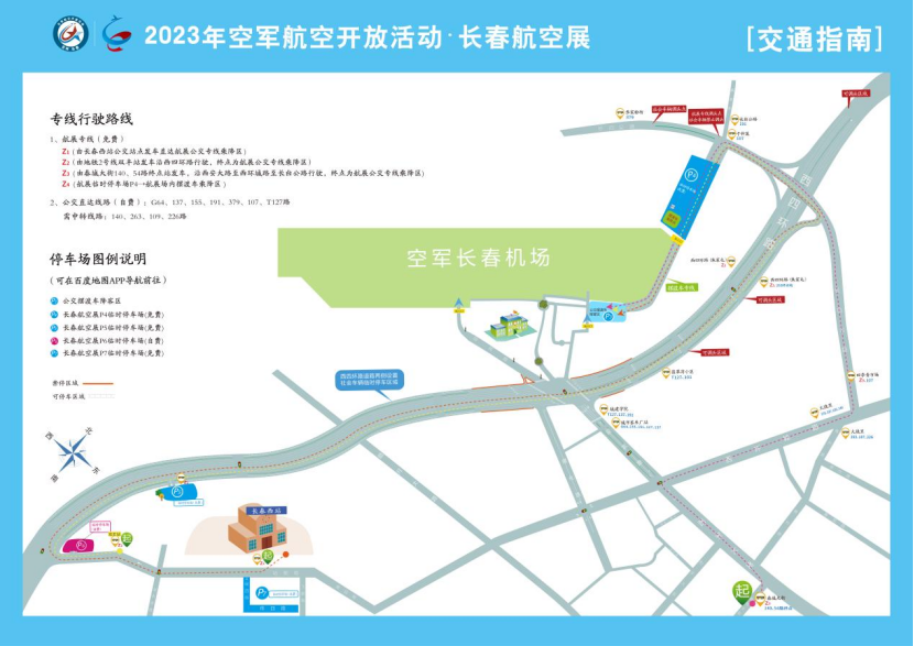 空军长春机场位于长春市绿园区迎宾路与西四环路交会西侧约1公里处,可自行驾车、乘地铁和公交等方式前往观展。