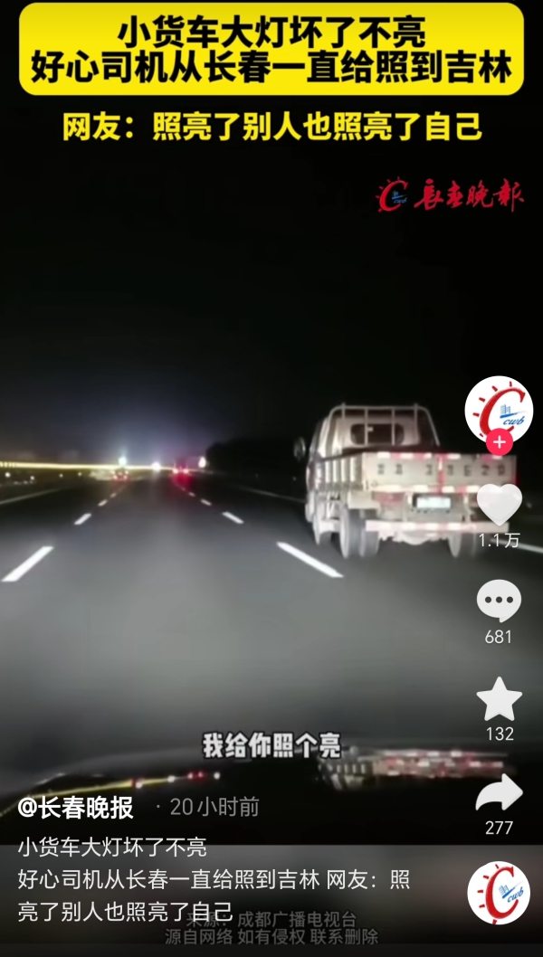 7月25日晚,在长春至吉林的高速公路上,一辆小货车的大灯坏了。好心司机在小货车后面,为其照亮,从长春一直照到吉林西。小货车开多快,后车开多快。网友:照亮了别人,也照亮了自己。