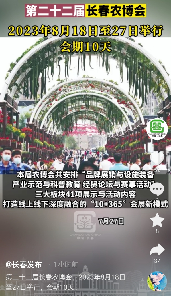 7月27日,中国吉林网在第二十二届中国长春国际农业·食品博览(交易)会新闻发布会上获悉,本届农博会将于8月18日至27日,在长春农博园举行,会期10天。