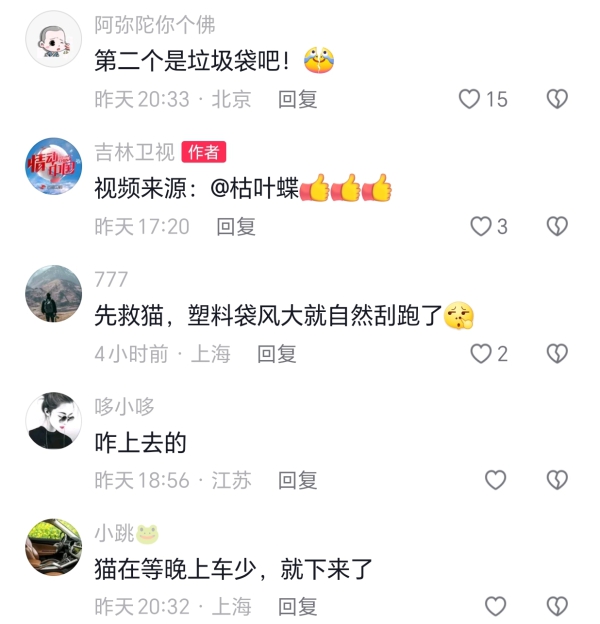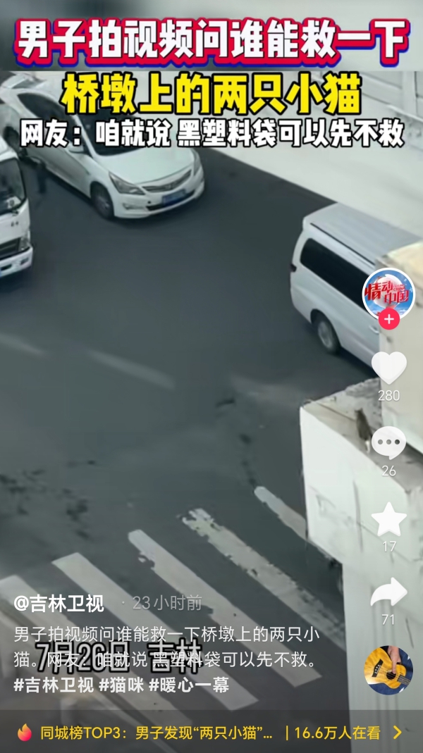 近日,长春,男子拍视频问谁能救一下高架桥桥墩上的两只小猫。网友:咱就说,黑塑料袋可以先不救。