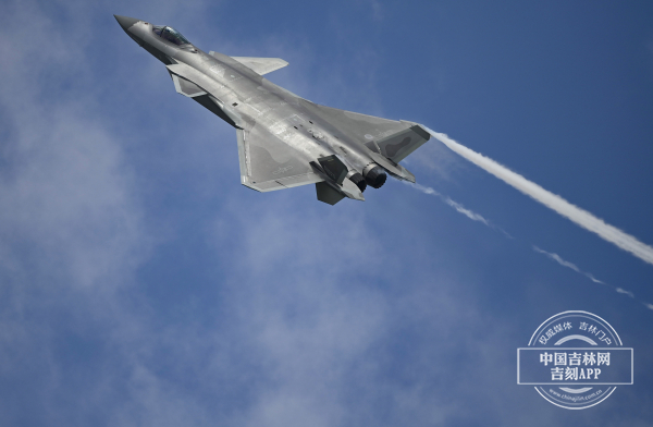在空军航空开放活动·长春航空展的飞行表演中,歼-20四机编队惊艳登场,以尾后队形密集编队低空通场方式,用空中最高礼节表达对现场观众的崇高敬意。