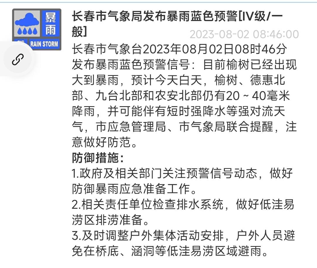 长春市气象台2023年08月02日08时46分发布暴雨蓝色预警信号:目前榆树已经出现大到暴雨,预计今天白天,榆树、德惠北部、九台北部和农安北部仍有20~40毫米降雨,并可能伴有短时强降水等强对流天气,市应急管理局、市气象局联合提醒,注意做好防范。