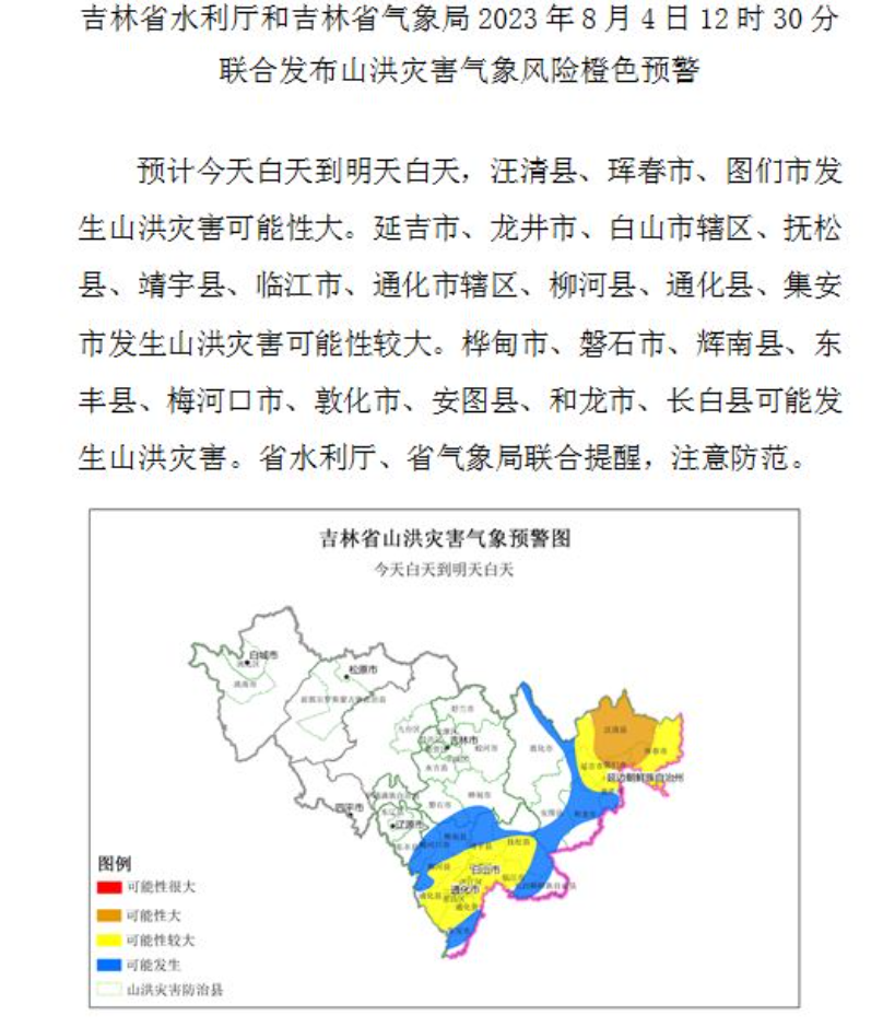 吉林省水利厅和吉林省气象局2023年8月4日12时30分联合发布山洪灾害气象风险橙色预警:预计今天白天到明天白天,汪清县、珲春市、图们市发生山洪灾害可能性大。延吉市、龙井市、白山市辖区、抚松县、靖宇县、临江市、通化市辖区、柳河县、通化县、集安市发生山洪灾害可能性较大。桦甸市、磐石市、辉南县、东丰县、梅河口市、敦化市、安图县、和龙市、长白县可能发生山洪灾害。省水利厅、省气象局联合提醒,注意防范。