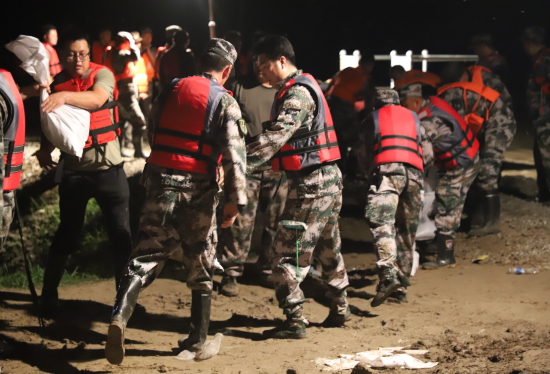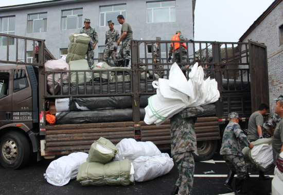 吉林省吉林军分区组织民兵分队开展防汛物资运送作业 时鹏摄