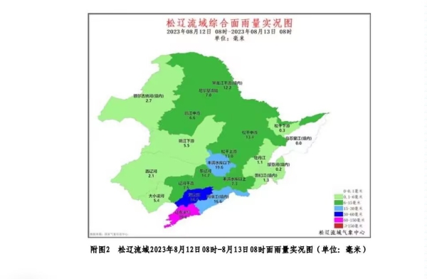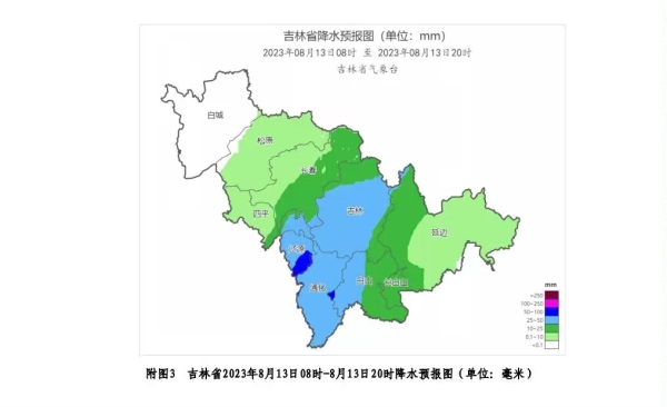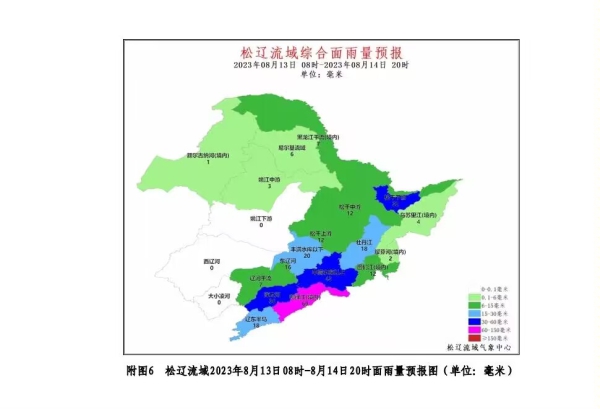 流域降雨预报:各子流域较强降雨主要时段均为13日白天至夜间,拉林河流域过程面雨量为15~30毫米;图们江流域过程面雨量为8~20毫米;鸭绿江流域过程面雨量为40~80毫米;嫩江上中游流域过程面雨量为2~10毫米。
