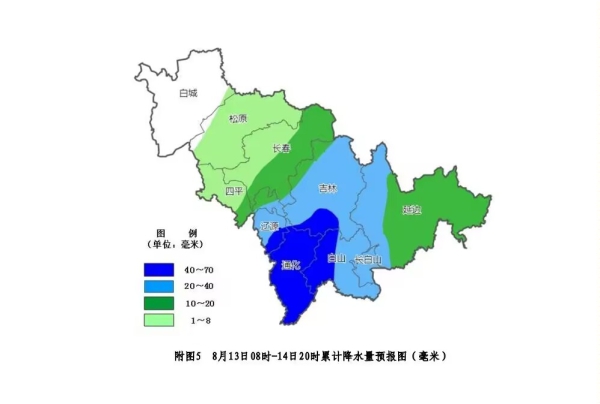 目前主体雨带位于我省中部,呈南北带状分布,此轮降水将持续至14日。其中,强降雨主要集中在13日白天到夜间,四平东南部、辽源、吉林、通化、白山西部、延边西部有大到暴雨,长春东部、四平中部、白山东部、延边东部、长白山保护区有中到大雨,松原、长春西部、四平西部有小雨;
