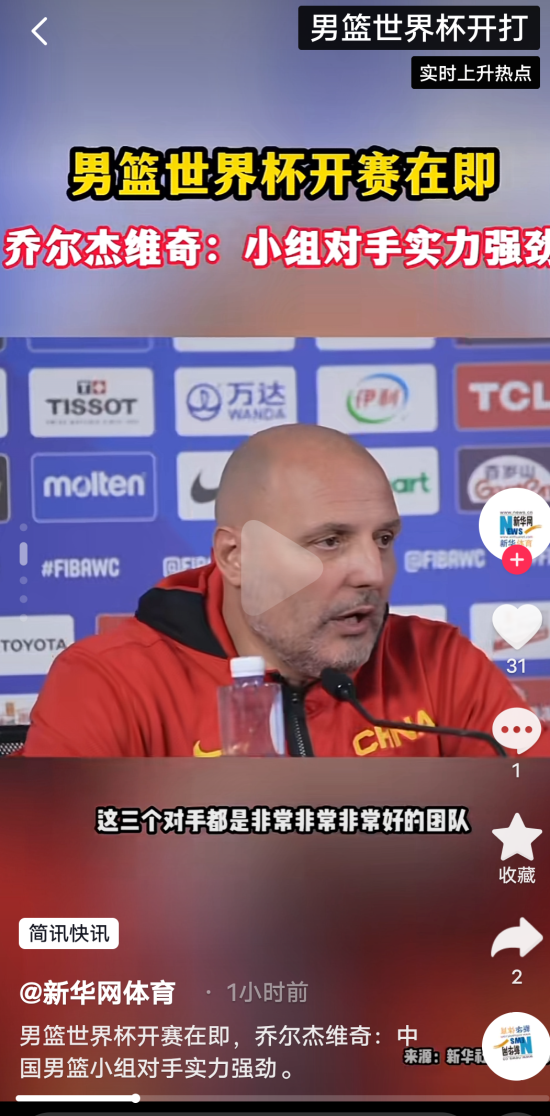 体育方面,男篮世界杯开赛,中国男篮将在明天迎来首战,对手是实力强大的塞尔维亚。