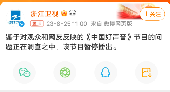 据浙江卫视微博消息,鉴于对观众和网友反映的《中国好声音》节目的问题正在调查之中,该节目暂停播出。