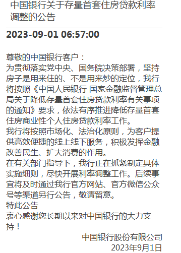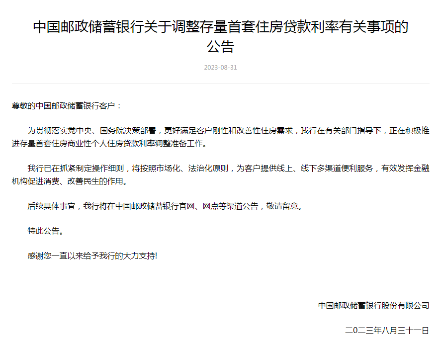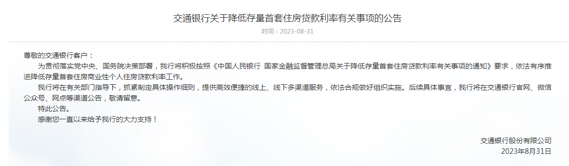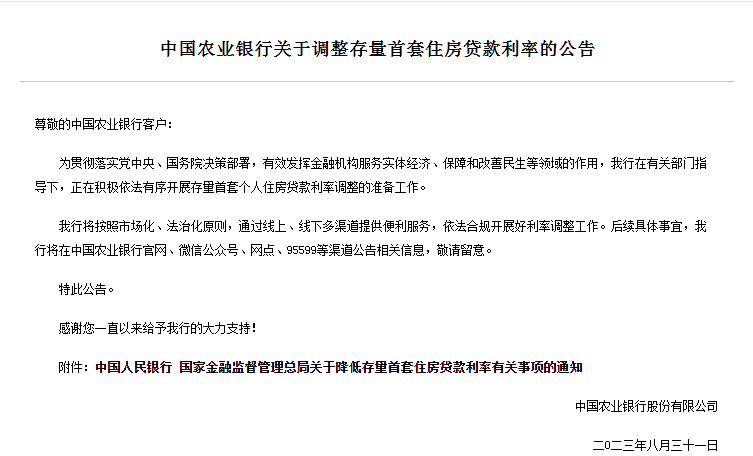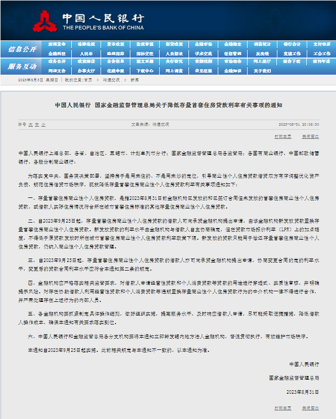 8月31日,中国人民银行官网发布《中国人民银行 国家金融监督管理总局关于降低存量首套住房贷款利率有关事项的通知》(以下简称《通知》)。《通知》发出后,多家银行第一时间发布公告表态,将有序推进存量个人住房贷款利率调整工作。