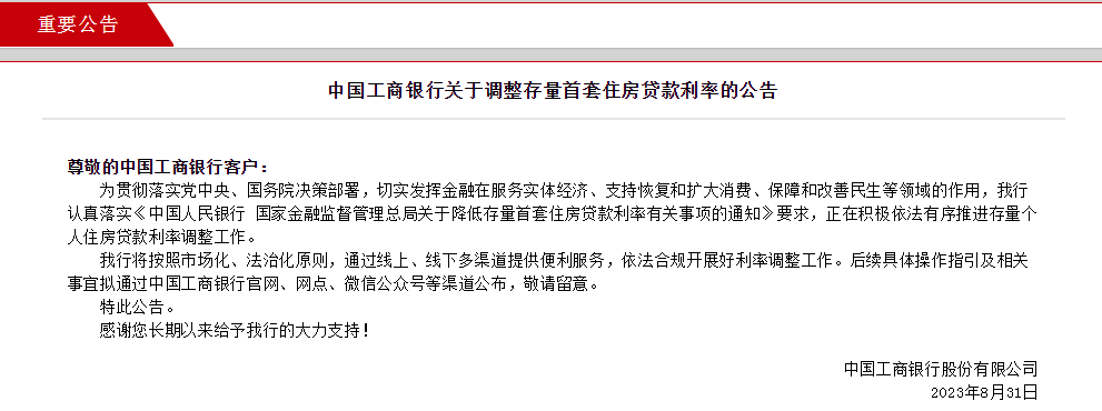 8月31日晚间,工商银行发布公告称:“认真落实《中国人民银行 国家金融监督管理总局关于降低存量首套住房贷款利率有关事项的通知》要求,正在积极依法有序推进存量个人住房贷款利率调整工作。”