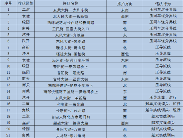 为了规范路口行车秩序,提高路口通行能力,预防和减少因交通违法行为引发道路交通事故。长春市在以下路口安装了高清电子警察和监控智能球机设备。现向社会公示,请广大交通参与者周知。
