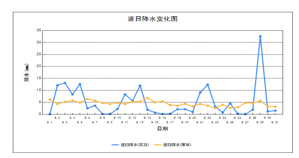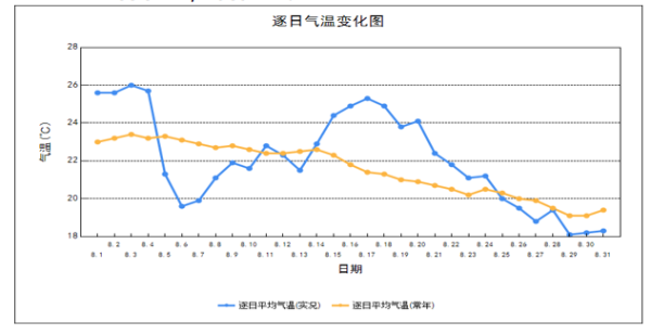 8月1-4日和14-24日为高温段,全省平均气温分别较常年高2.6℃和2.2℃,居历史同期气温偏高的第7位和第3位。