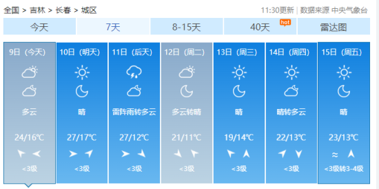 9日夜间松原地区最低气温为11℃左右,其他地区14~18℃;10日白天延边地区最高气温为22℃左右,其他地区24~28℃,长春市9日夜间最低气温:16℃,10日白天最高气温:27℃。