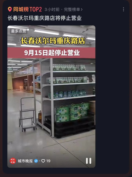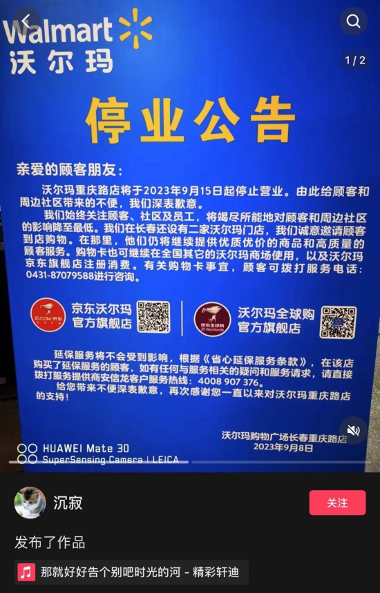9月8日,沃尔玛重庆路店发布公告称将于2023年9月15日起停止营业。