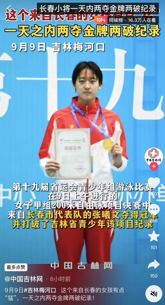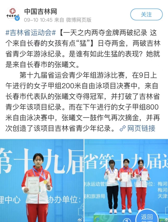 日夺两金,两破吉林省青少年游泳纪录。她就是来自长春的张曦文。