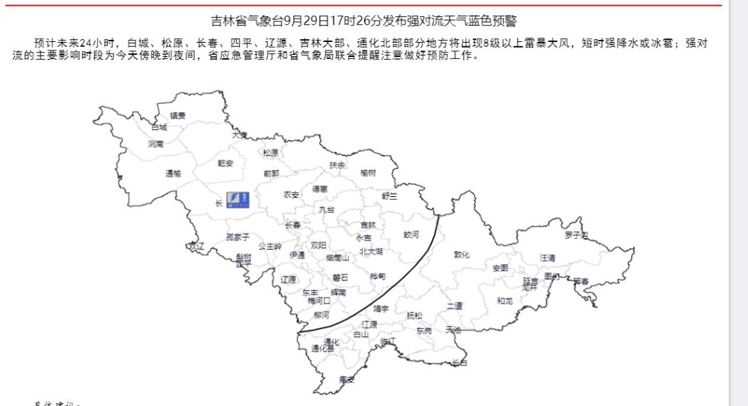 吉林省气象台9月29日17时26分发布强对流天气蓝色预警:预计未来24小时,白城、松原、长春、四平、辽源、吉林大部、通化北部部分地方将出现8级以上雷暴大风,短时强降水或冰雹;强对流的主要影响时段为今天傍晚到夜间,省应急管理厅和省气象局联合提醒注意做好预防工作。