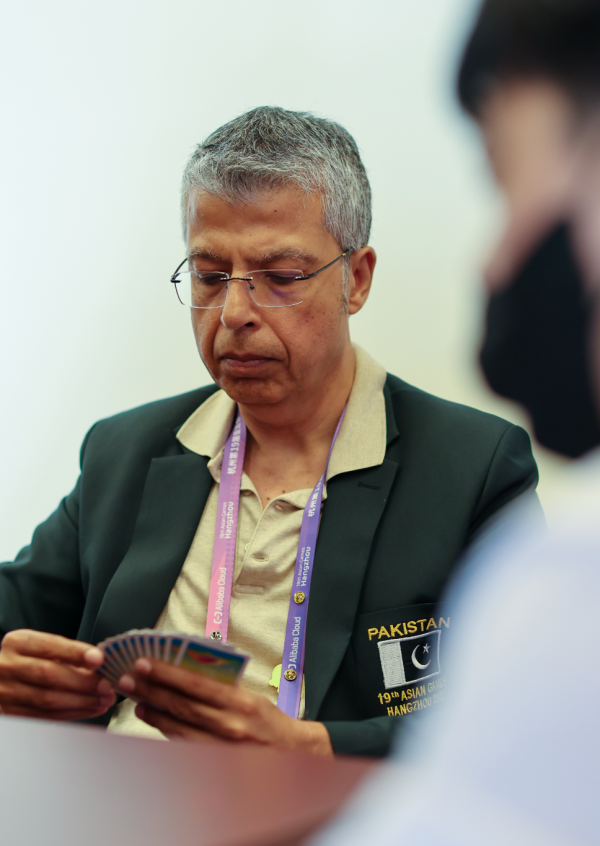 在此前进行的杭州亚运会桥牌比赛男子团体项目预赛中,出现了本届赛事迄今最戏剧性的一组对决——巴基斯坦队对阵新加坡队。