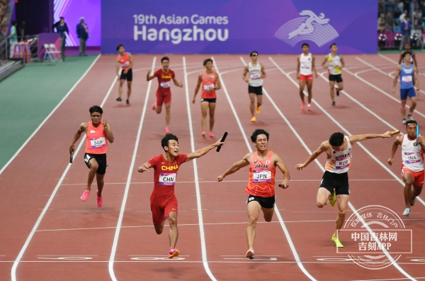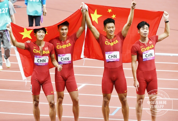 小哪吒造型的第四棒选手葛曼棋冲向终点线,中国队斩获女子4×100米金牌。20分钟后,第四棒选手陈佳鹏绝地反击,中国队以38.29秒的成绩刷新亚运会男子4×100米纪录,再夺金牌。