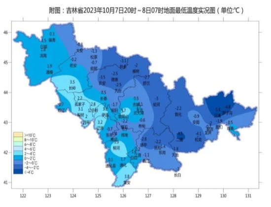 受强冷空气影响,10月8日早晨,我省北部和东部有32站出现霜冻,地面最低温度在0℃以下,地面最低温度前五位:汪清-5.6℃,罗子沟-4.8℃,二道-4.5℃,和龙-4.1℃,农安-3.5℃。