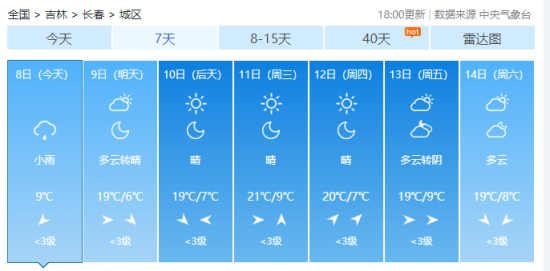 8日夜间到9日白天,全省多云,白城南部、松原南部、长春南部、四平、吉林西南部、辽源、通化、白山西部、长白山保护区有阵雨或雷阵雨。