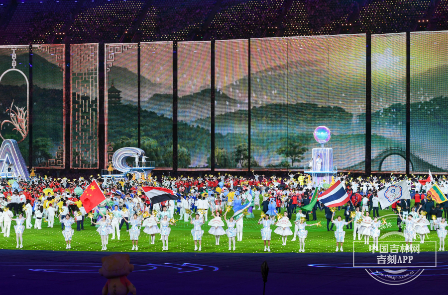 杭州第19届亚运会闭幕式,45个国家和地区的代表团旗帜入场