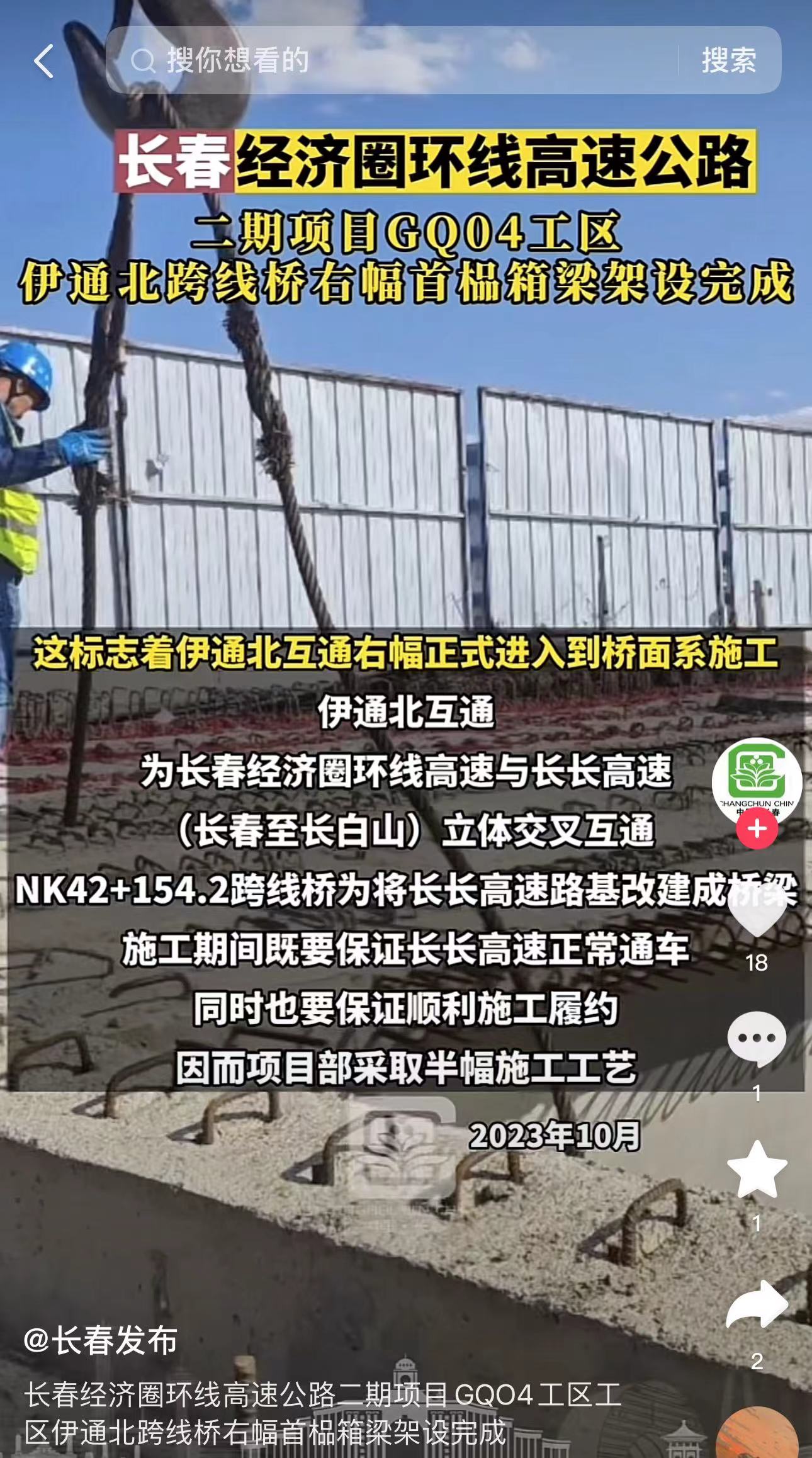 近日,由中交一航局二公局三公局机电局联合体承建的长春经济圈环线高速公路二期项目GQ04工区伊通北跨线桥右幅首榀箱梁架设完成,标志着伊通北互通右幅正式进入到桥面系施工。