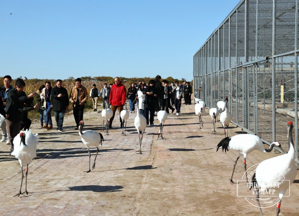 在仙鹤岛,随着鹤的清鸣声,采访团与人工驯化的半散养的丹顶鹤来了一次“亲密接触”。当几十只丹顶鹤展开双翼凌空而起,当丹顶鹤掠过身边的时候,大家纷纷惊叹“宛如仙境”。