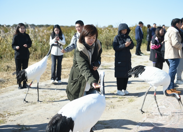 “作为景区特色游览项目,来到这里的游客都十分喜爱与丹顶鹤亲密接触,我们提供玉米粒,游客可亲自喂食丹顶鹤,也可以在观景台上观看‘放鹤’奇观。”景区工作人员介绍,所谓“放鹤”,即每日按固定时间将饲养笼中的丹顶鹤放飞,丹顶鹤在空中逆风展翅盘旋数周后,便会自行归巢。