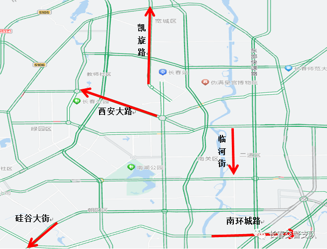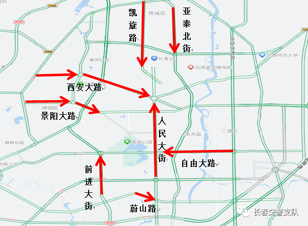 早高峰期间,中小学周边、“两横三纵”快速路将短时间出现车流集中情况。亚泰北街北向南方向,凯旋路北向南方向,西安大路西向东方向,景阳大路西向东方向,蔚山路西向东方向,前进大街南向北方向,人民大街南向北方向,自由大路东向西方向等道路进城方向出现潮汐车流。