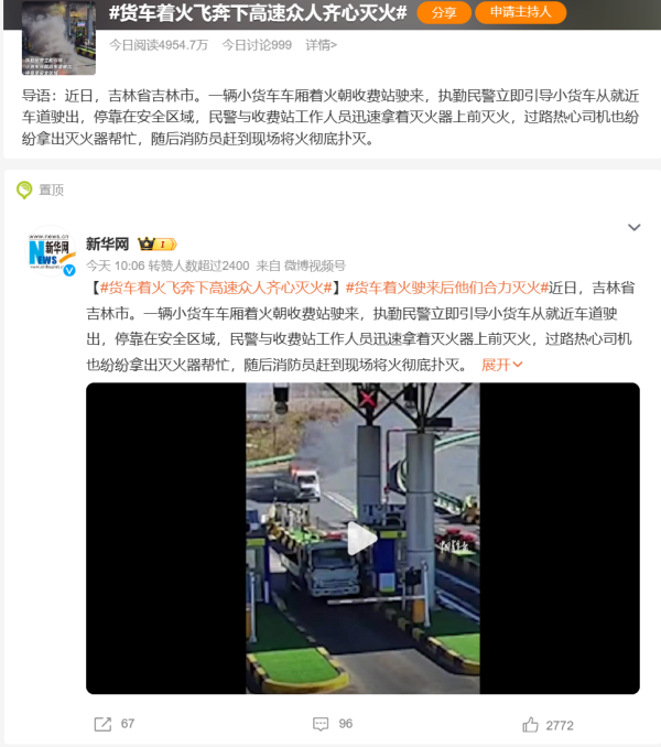 榜单第二条,货车变“火”车,飞奔救火获赞上热搜!