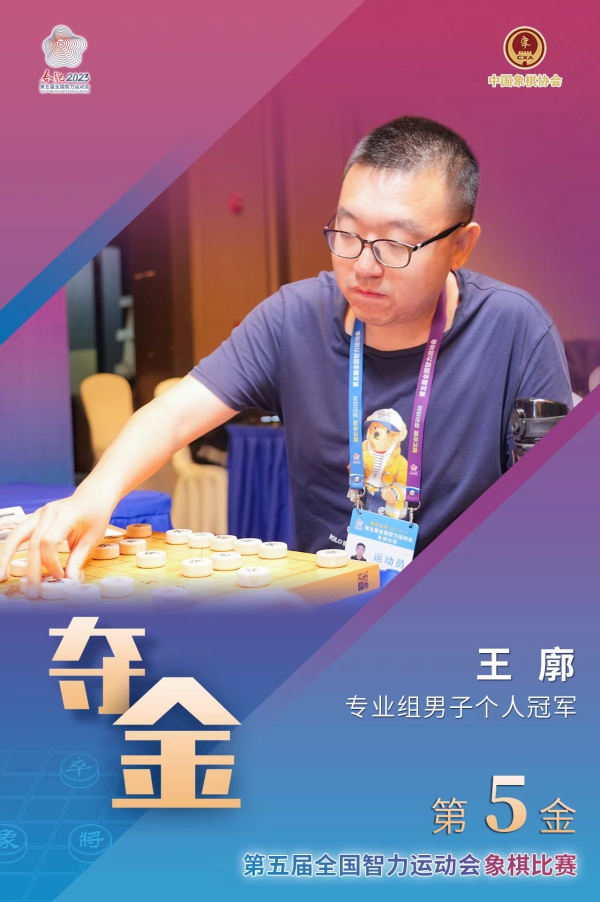 我省青年象棋特级大师王廓不畏强手,过关斩将,经过9轮比赛的激烈争夺,夺得全国第五届智力运动会中国象棋专业组冠军!四年一届的全国智力运动会是我国竞技水平最高,规模最大的棋牌类综合体育盛会。这是我省选手智运会象棋历史上的首枚金牌。
