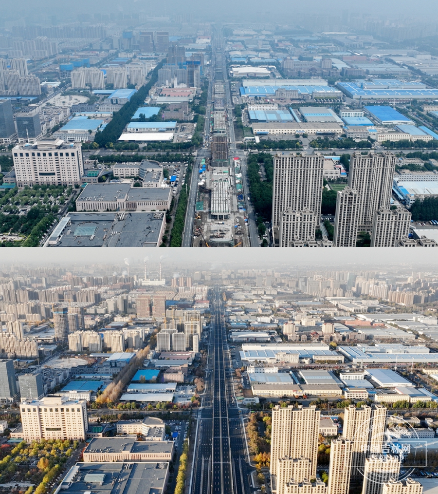 上图:2023年3月9日航拍镜头下的世纪大街工程南四环方向和卫星路方向。