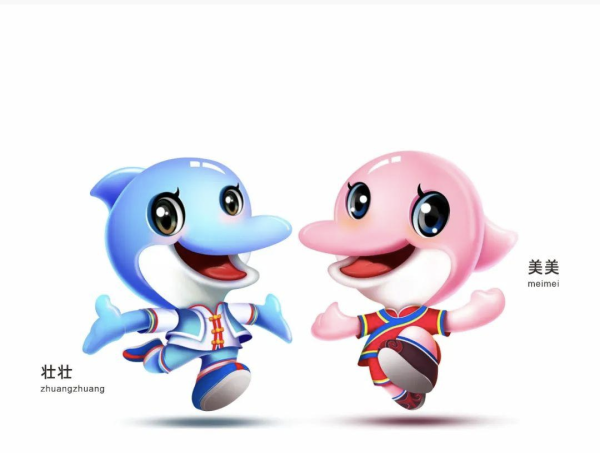 吉祥物以广西北部湾珍稀保护动物中华白海豚为创意原型,分别取名“壮壮”“美美”,搭配壮锦和民族服饰,突显广西壮美的民族特色和地域风格。温和友善的海豚形象展现出壮乡人民欢迎八方来客的热情。
