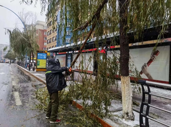 11月6日,暴风雨雪如期而至,面对恶劣天气,长春市绿化管理中心组织工作人员顶风冒雪、彻夜不眠在街路绿地内清理积雪和倒伏折枝树木,奋战暴风雨雪。