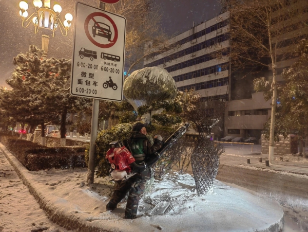 6日中午逐渐开始降雪,随着雪量的增大,为了尽快清理压在植物上的冰雪,工作人员采取人工除雪和机器除雪相结合的方式,及时对人民大街、新民大街、南湖大路、前进大街等重点街路及广场、绿地的主要乔灌木开展除雪保障作业。
