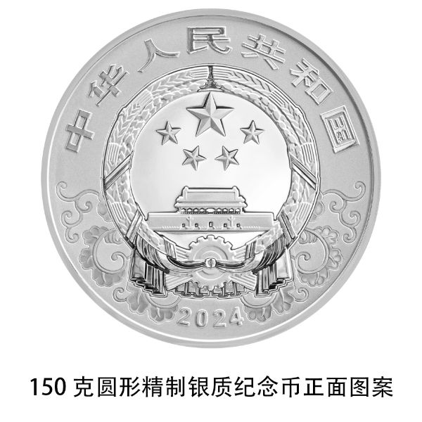150克圆形银质纪念币为精制币,含纯银150克,直径70毫米,面额50元,成色99.9%,最大发行量8000枚。