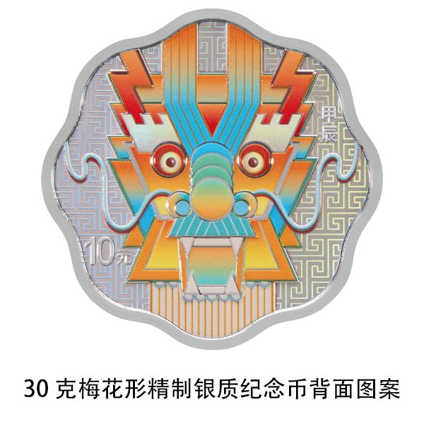 30克梅花形银质纪念币背面图案为装饰龙造型,衬以回纹纹饰。