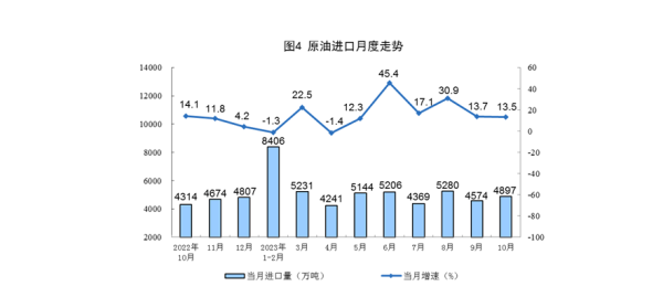 记者在内容中看到,原油生产增速略有加快,进口保持较快增长。10月份,生产原油1733万吨,同比增长0.5%,增速比9月份加快0.2个百分点,日均产量55.9万吨。进口原油4897万吨,同比增长13.5%,增速比9月份放缓0.2个百分点。