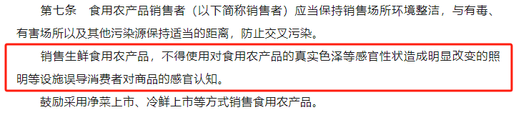 新规规定:不得使用对食用农产品的真实色泽等感官性状造成明显改变的照明等设施