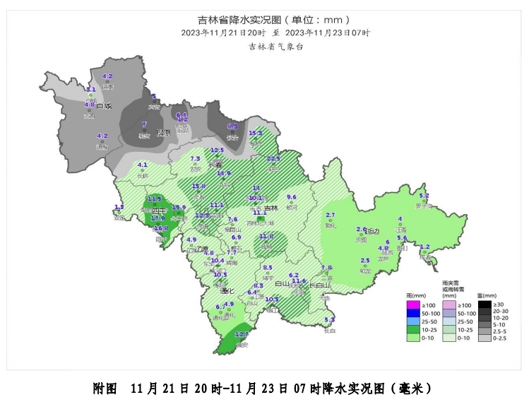 23日,中国吉林网从省气象局获悉,受高空槽和地面气旋共同影响,11月21日夜间开始,我省大部分地区出现雨雪天气,中部部分地方出现大雪或中雨。