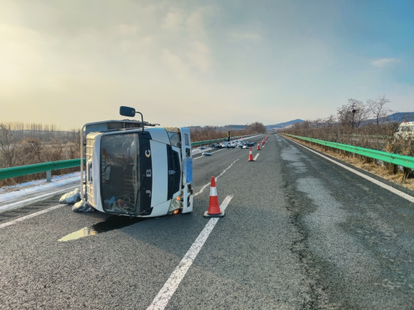11月26日13时50分许,省高速公路公安局延吉分局巡逻民警巡逻至珲乌高速98公里时,发现一辆货车侧翻在路上,车头占右侧行车道,车尾在应急车道内,车上拉的煤炭散落一地,由于该路段位于急弯长下坡路段,事故车辆还占着一条行车道。两名民警立即从警车内将防护锥桶和事故现场标志牌取出,在确保安全的情况下,穿越中央护栏对事故现场进行安全防护,隔离出左侧车道供其他车辆行驶,并联系路政人员到现场进行救援。