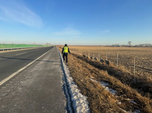 12月7日,吉林高速公安白城分局巡逻三大队民警在珲乌高速执行巡逻任务时,发现应急车道内有几只羊正在悠闲地散步吃草,过往车辆纷纷避让,十分危险。如果羊群冲上高速公路,后果更是不堪设想。民警立即将警车停在应急车道内,做好安全防护后将羊群赶下高速公路,及时消除了道路交通安全隐患。
