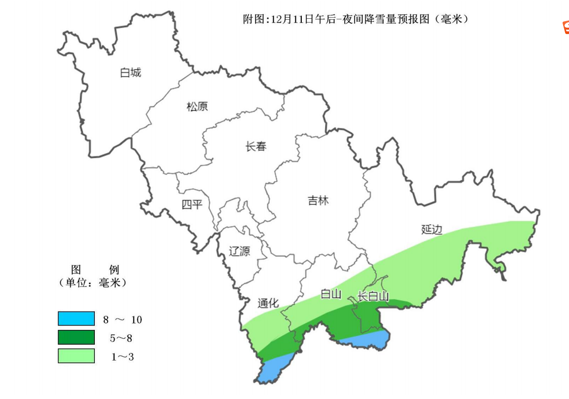 10日,中国吉林网从省气象局获悉,受地面南方气旋影响,预计12月11日中午至夜间,我省东南部有一次降雪天气过程,雪区范围较小。